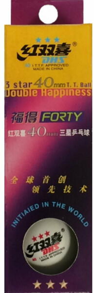 DHS 3-Star 40 "Forty" pingponglabda (3 db/doboz)A Double Happiness 3-Star 40 pi ngponglabda a kínai gyártó legjobb minőségű celluloid pingponglabd ája, amely több világversenynek is korábban a hivatalos labdája volt. A DHS 3-Star 40 pingponglabdát ajánljuk edzésekhez, házi bajnokságok lebonyolításához, illetve mindazoknak, akik újra átszeretnék élni a korábbi pingponglabdák által nyújtott teljesítményt és játékélményt. DHS 3-Star 40 pingponglabda az alábbi verseny hivatalos labdája volt:
